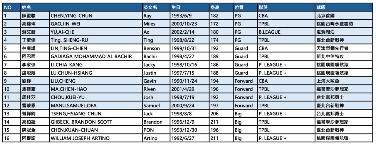 後衛:陳盈駿(CBA北京首鋼)、高錦瑋(TPBL桃園台啤永豐雲豹)、游艾喆(B.League滋賀湖泊)、丁聖儒(TPBL台北台新戰神)、林庭謙(CBA天津榮鋼先行者)、阿巴西(TPBL新北中信特攻)、李家慷(PLG桃猿璞園領航猿)、盧峻翔(PLG桃猿璞園領航猿)