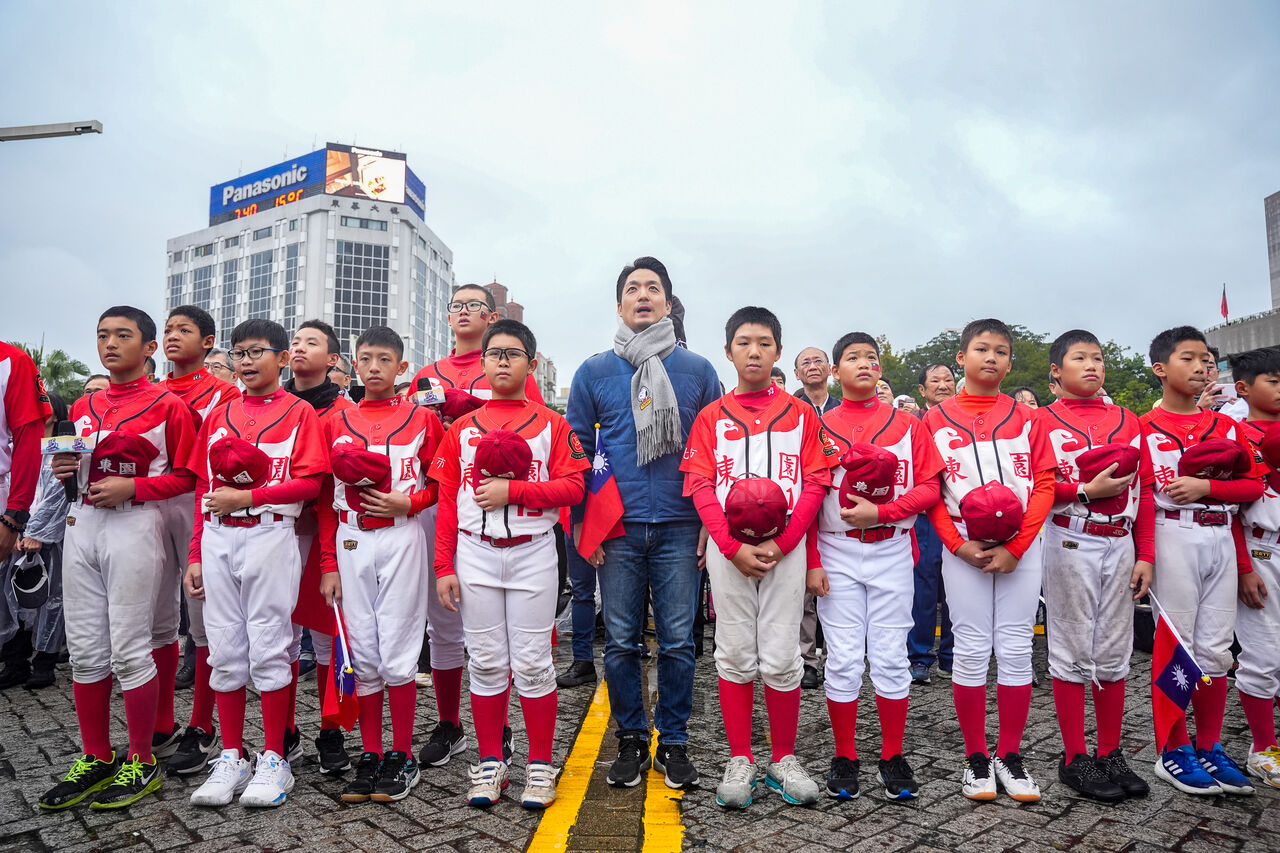 ▲臺北市元旦升旗暨路跑,台北市市長蔣萬安與東園國小小球員唱國歌。(圖/臺北市政府體育局提供)