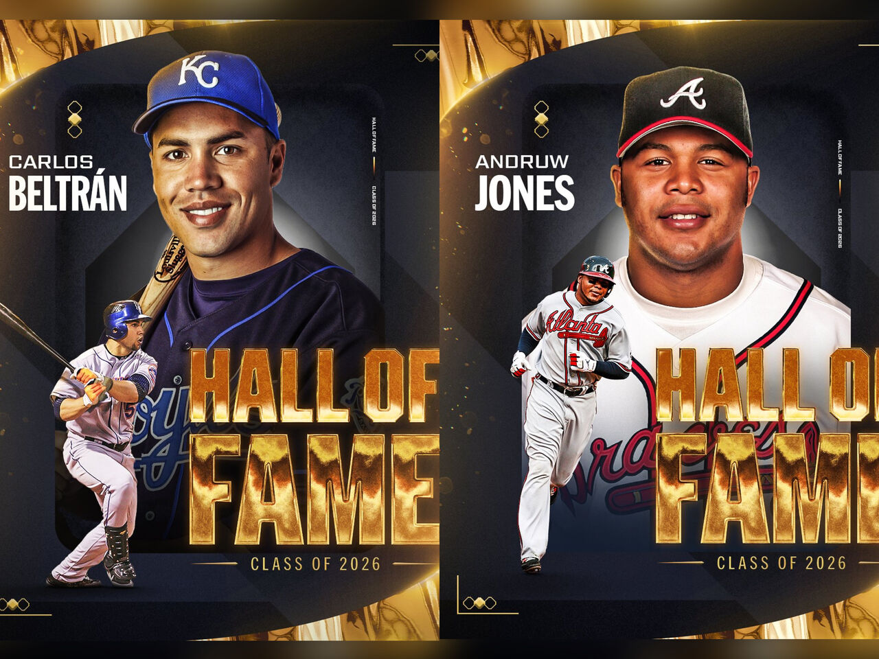 ▲ 大聯盟官方公布 2026 年名人堂入選名單,貝爾川(Carlos Beltrán,左)與瓊斯(Andruw Jones,右)雙雙當選,兩位傳奇中外野手將於 7 月在庫柏鎮舉行入堂典禮,正式躍上棒球最高殿堂 。(圖/截自MLB X)