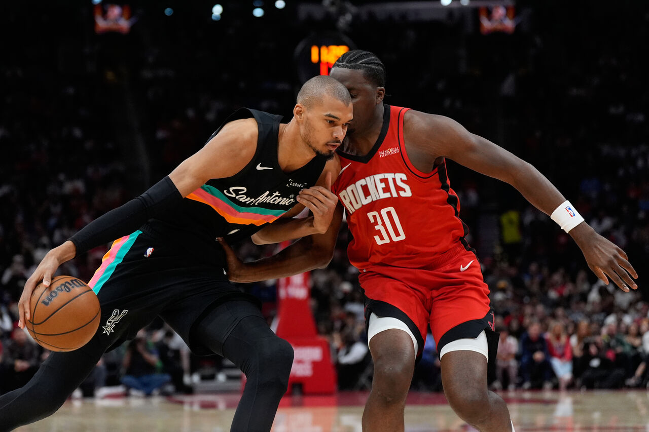 馬刺今日作客火箭主場,上半場黑衫軍表現相當亮眼,尚帕尼(Julian Champagnie)首節個人飆進4記三分球,溫班亞瑪次節也有10分進帳,上半場攻勢平均的馬刺就以70比60領先。