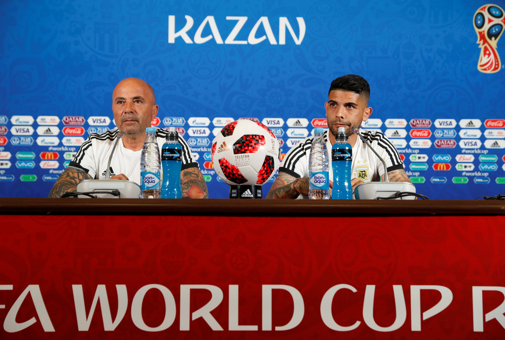 ▲阿根廷教練桑保利(左)與球員巴內加(Éver Banega)出席賽前新聞記者會(圖/路透)