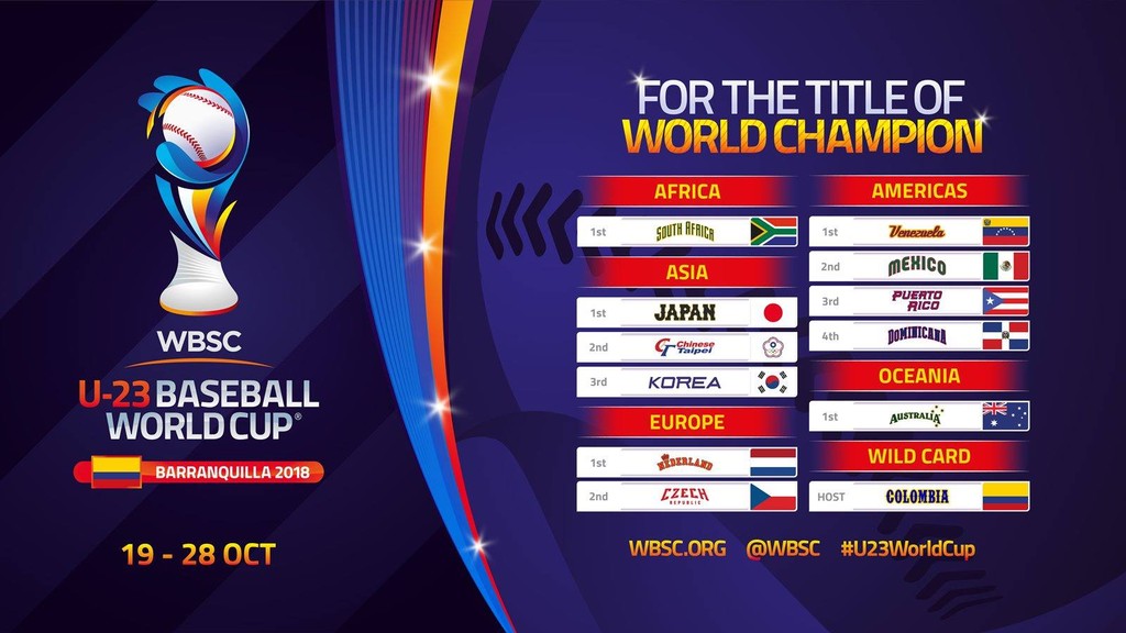 U23世界盃將於10月19日至28日在哥倫比亞舉行,日前WBSC國際棒壘球總會公布參賽國,確定美國、古巴未參賽,不失為中華隊爭取佳績,增加積分的好機會。
