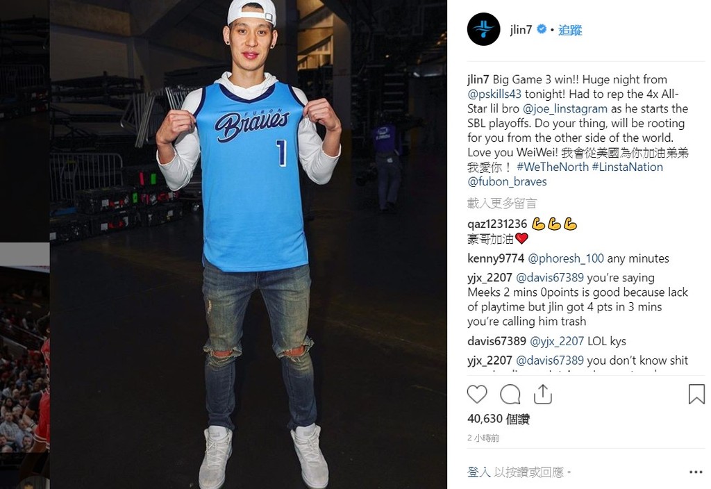 暴龍20日面對魔術的季後賽系列第3戰,終場以98比93險勝,取得2比1領先,不過在連續兩戰就沒有上場的林書豪,此役再度被冰整場,但豪哥仍沒有灰心,還在IG上大讚西亞卡姆(Pascal Siakam)今晚表現,並穿上富邦勇士隊1號球衣,替弟弟林書緯在SBL季後賽打氣。