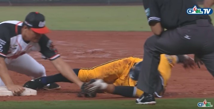 人比球還早撲回一壘,但下雨場地溼滑,陳偉漢竟然人滑過去一壘,本來手摸著壘包卻也滑出去了。高國慶看到他滑過頭了,要去觸殺他的身體,陳偉漢再一個翻身,用右腳腳尖去碰到壘包,高國慶要觸殺已來不及,形成安全回壘的有趣畫面。