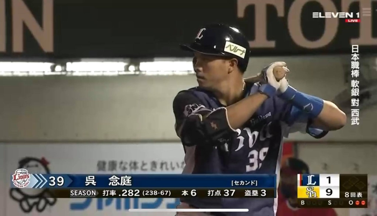西武獅30日續戰軟銀鷹,台灣好手吳念庭此役先發第5棒,打擊熄火,8局靠保送上壘,軟銀單場3轟,終場9比1勝出。