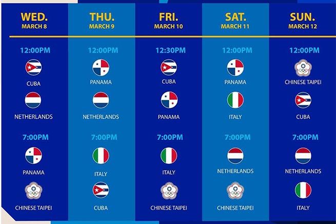世界棒球經典賽(WBC)明天點燃戰火,在台灣舉行的A組賽事率先開打。明天開始將一連五天、舉行10場賽事,中華隊將在8日晚間7點對上巴拿馬、10日晚間對上義大利、11日晚間對上荷蘭;最後一場則在12日中午12點對戰古巴。中華隊必須在A組取得前2名,才能打進前8強、前進日本東京。