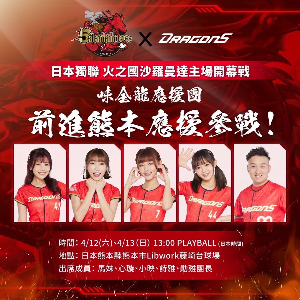 味全龍應援團首度前進日本熊本縣,球團今(27)日宣布,將在4月12日、4月13日於日本熊本縣熊本市Libwork藤崎台球場,為日本獨立聯盟火之國沙羅曼達主場賽事應援助威。