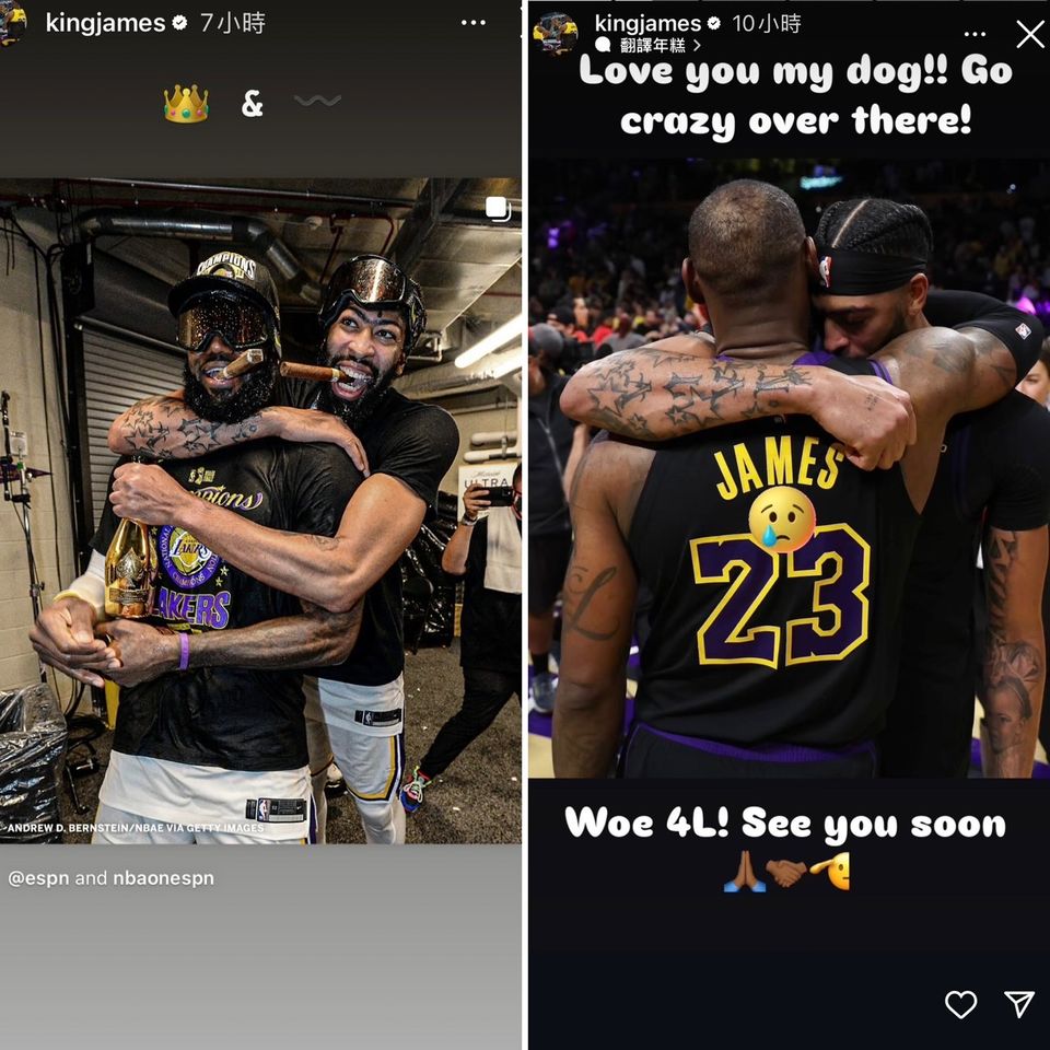 這則動態的配圖是戴維斯緊擁著詹姆斯,隨後詹皇又貼出兩人2020年一起慶祝奪冠時的合照,加上象徵兩人的皇冠和「一眉」的表情符號,這對雙人組也正式走入歷史。