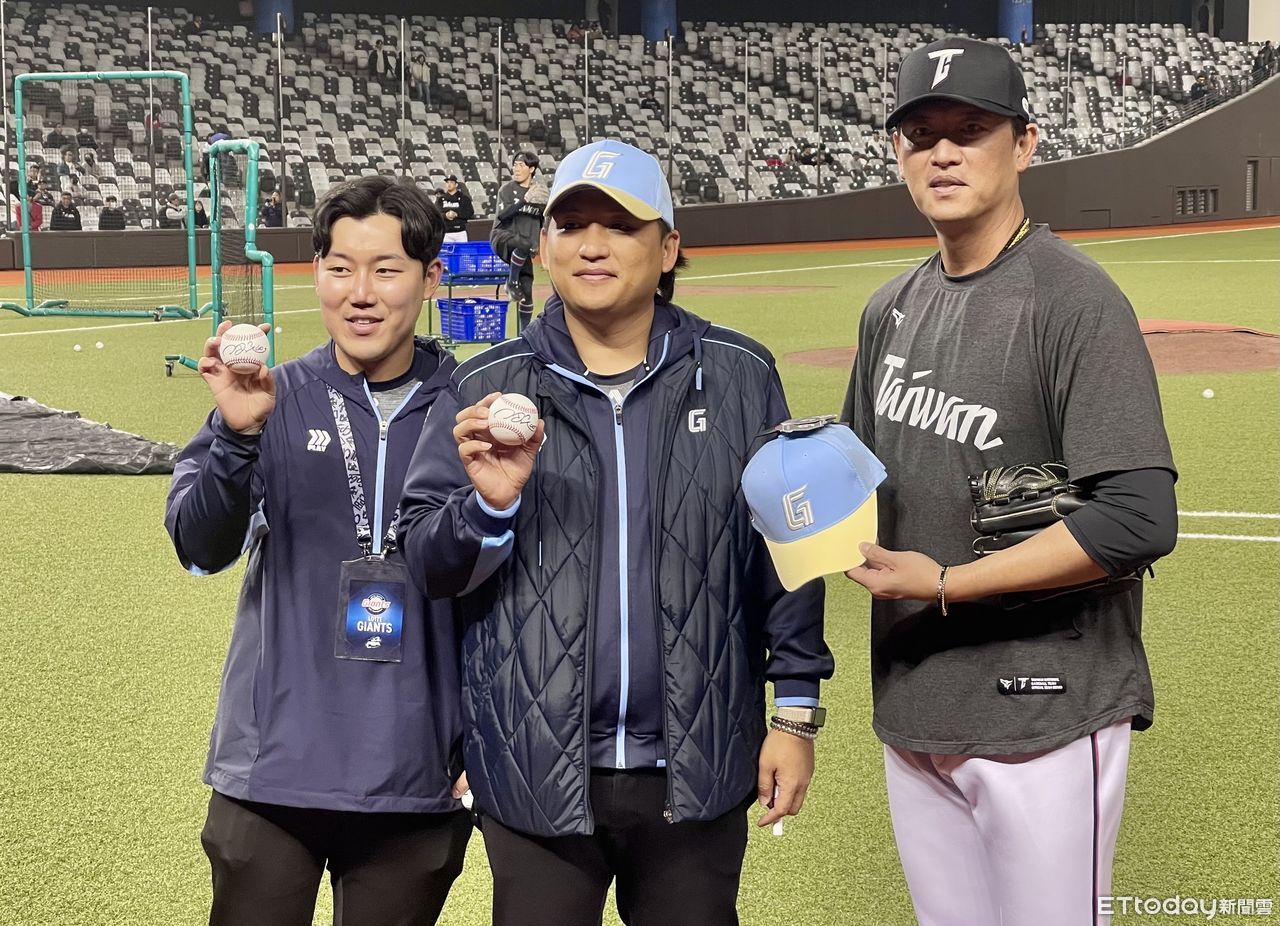 ▲台韓交流賽,韓職樂天巨人隊職員羅承賢(中)與王建民(右)合影。(圖/記者李毓康攝)
