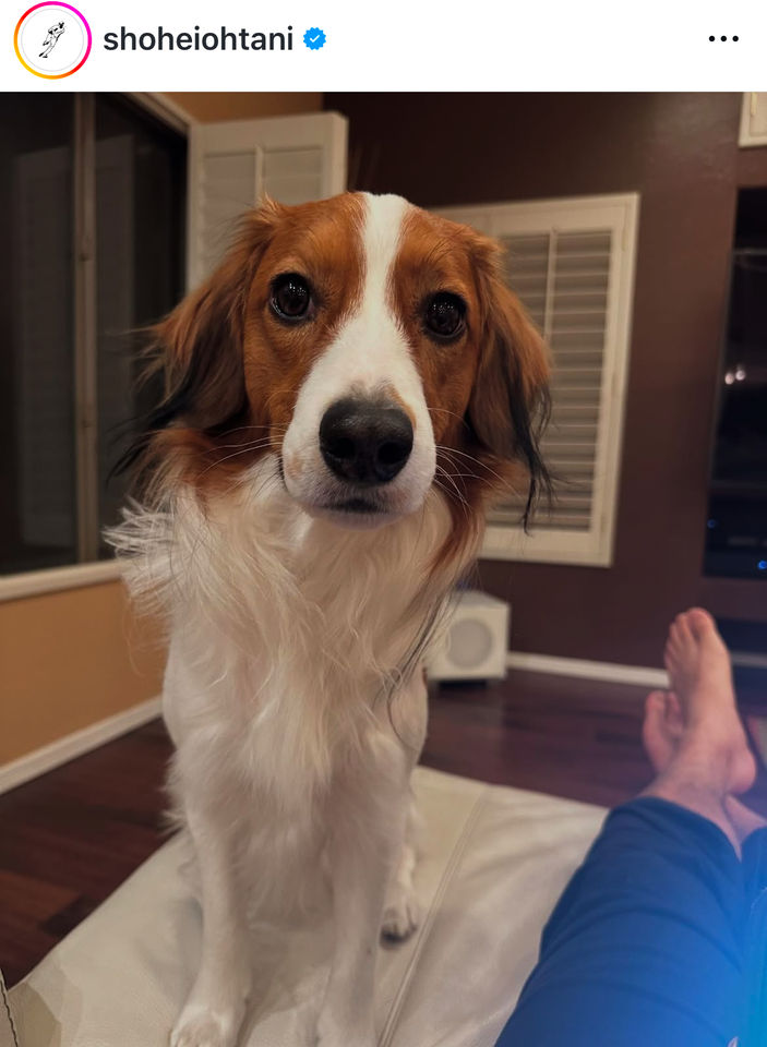 大谷僅以三個雙眼的表情符號作為貼文內容,並分享三張照片。照片中,Decopin有時從沙發底下偷看,有時則坐在沙發旁凝視主人,彷彿想吸引注意力,畫面溫馨可愛。