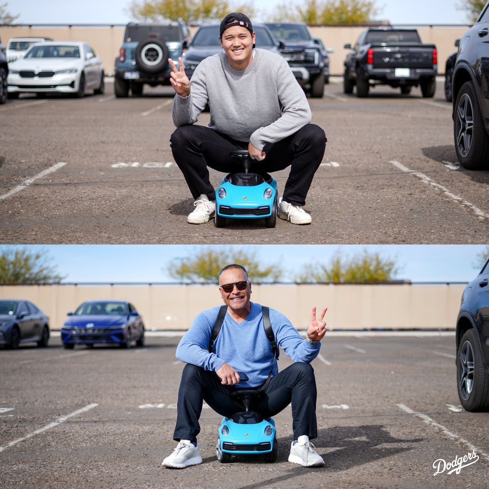 在道奇隊春訓營的球隊專用停車場內,羅伯斯專屬車位竟被一台藍色的「兒童版保時捷」占據。當他走向車位時,疑惑地問:「我的車去哪了?」結果映入眼簾的,竟是一台玩具車。他立刻察覺:「這是翔平的惡作劇嗎?」拍攝人員則笑著回答:「沒錯,就是他。」