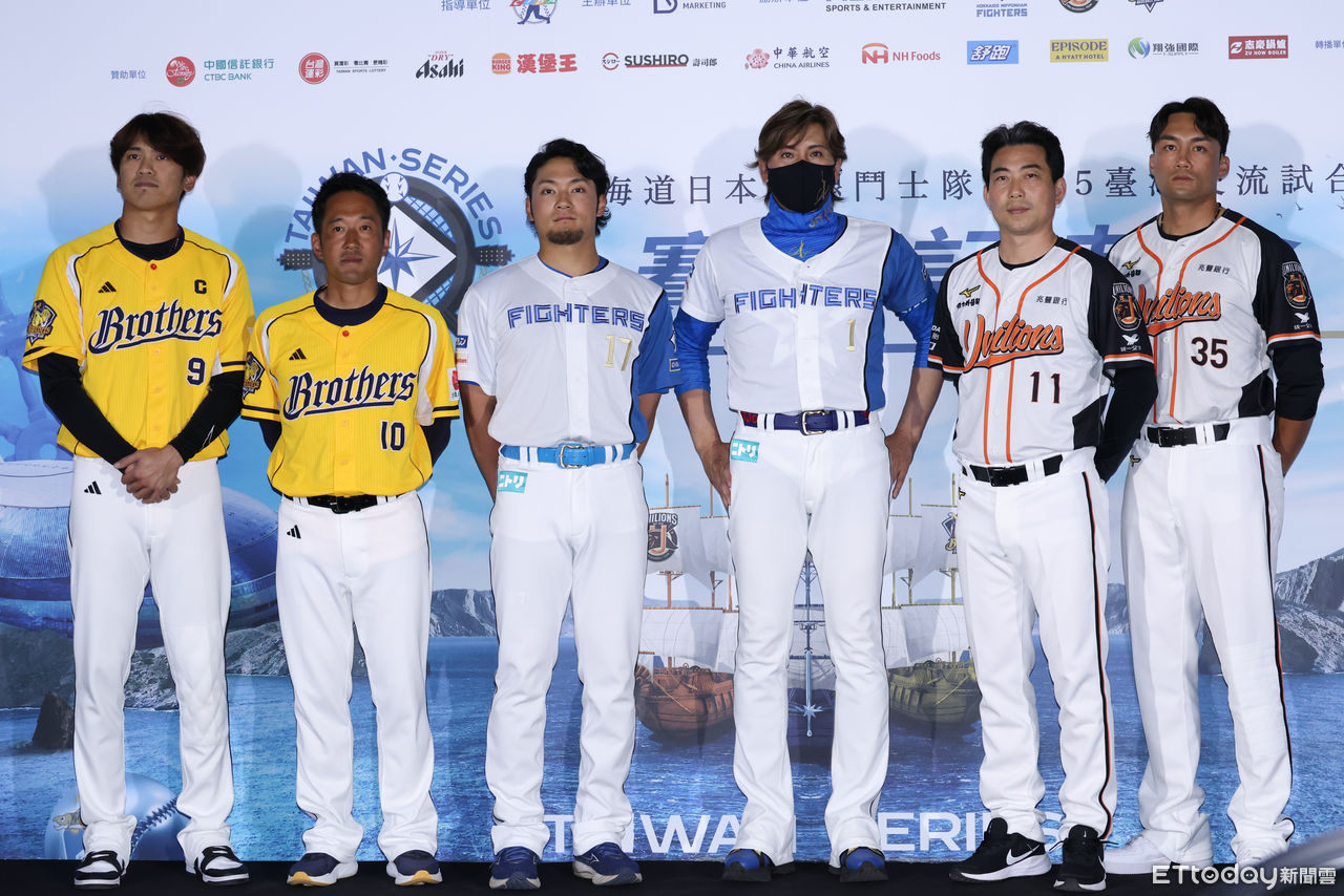 ▲北海道火腿交流賽賽前記者會-王威晨,平野惠一,伊藤大海,新庄剛志,,潘傑楷,林岳平。(圖/記者黃克翔攝)