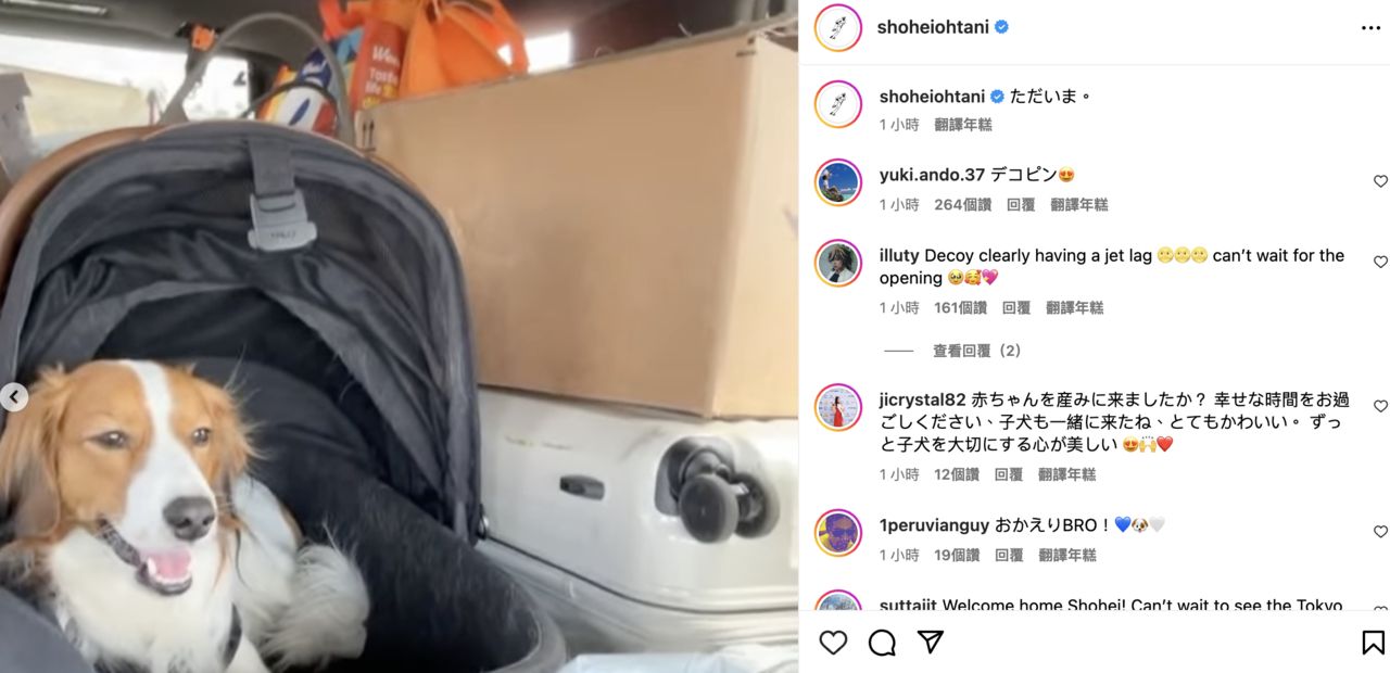 隨著大谷的專機降落羽田機場,他的貼文立即引發粉絲熱烈回應。特別引人注目的是,影片中出現了他的愛犬Decoy在行李堆中打哈欠的畫面,這讓粉絲們紛紛猜測Decoy是否隨主人一同來到日本。