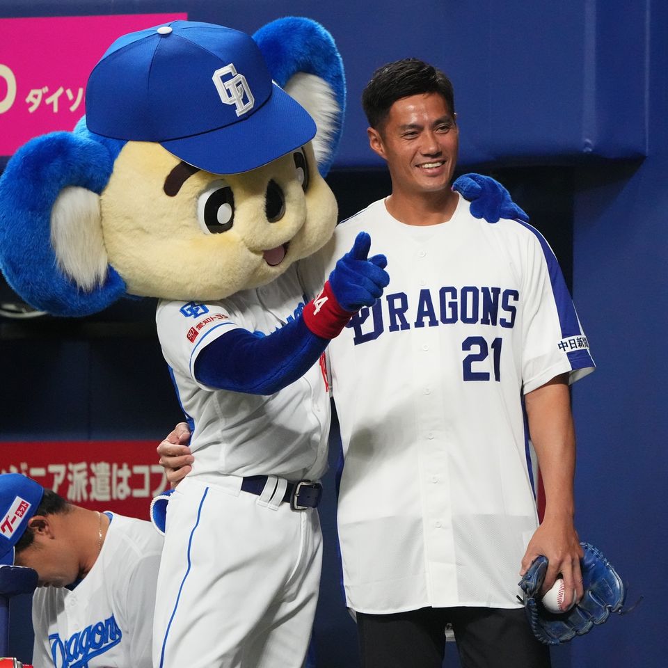 在球迷的熱烈掌聲中,他舉手致意,邁步走上投手丘。輕輕投出的那顆球測得球速為 95公里,筆直地飛向捕手的手套。曾經與他並肩作戰的大島洋平與大野雄大為他獻上花束,他露出燦爛的笑容。
