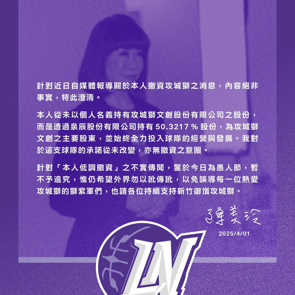 針對「本人低調撤資」之不實傳聞,鑒於今日為愚人節,暫不予追究,惟仍希望外界勿以訛傳訛,以免誤導每一位熱愛攻城獅的獅紫軍們,也請各位持續支持新竹御嵿攻城獅。