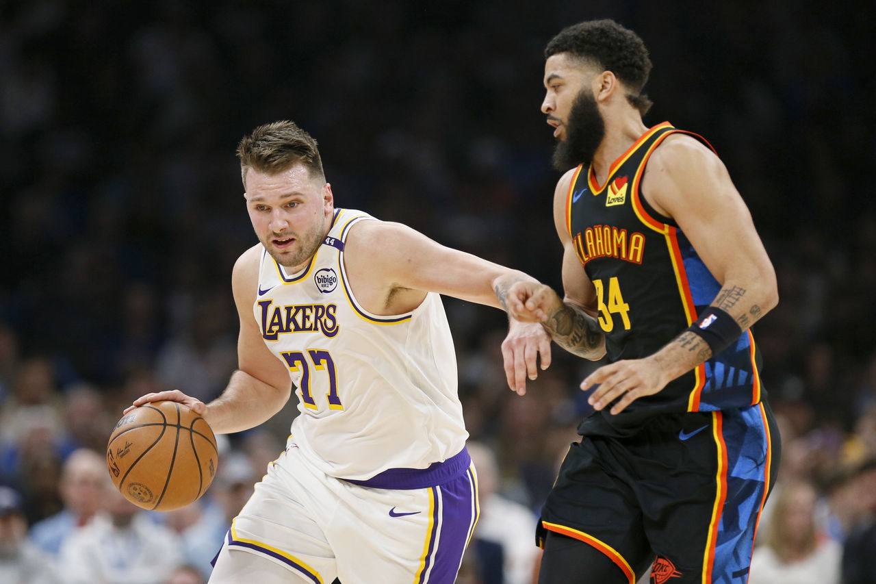 NBA例行賽進入倒數1周,湖人今(7)日強碰勝率超過8成的聯盟龍頭雷霆,開賽就火力全開,首節灌進42分,最終在3大得分手合力攻下69分之下,以126比99狂勝了27分,贏得關鍵一勝,持續穩居西區第3。「金童」唐西奇(Luka Doncic)整場美技連發,被天王詹姆斯(LeBron James)大讚。