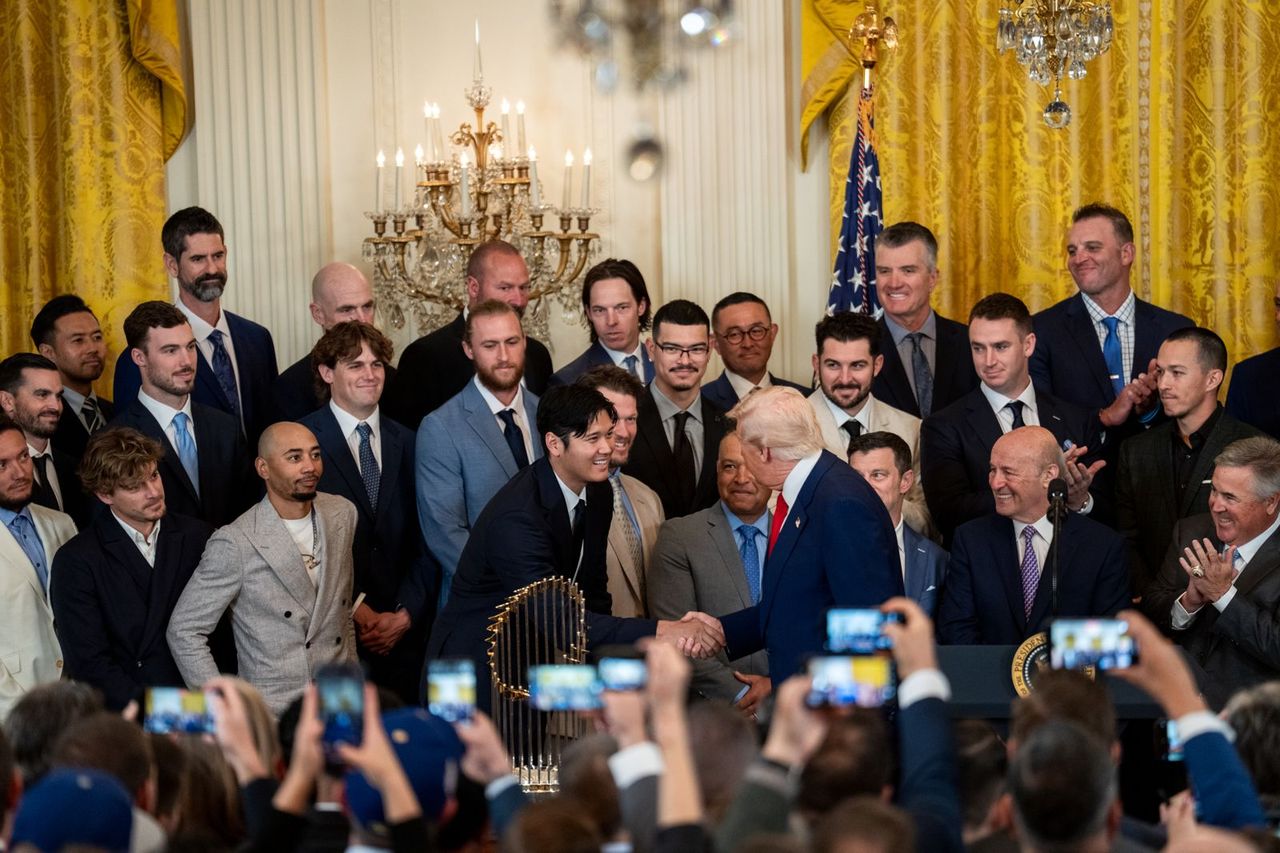 ▲川普在白宮接見去年世界大賽的冠軍隊伍道奇隊,並與陣中球星大谷翔平等人握手道賀。(圖/翻攝自The White House Flickr)