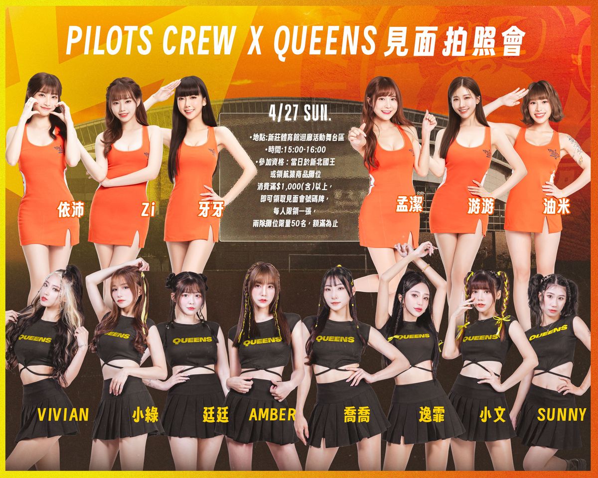 此外,除了場上精彩的賽事較勁,王猿做伙合作推出主場豐富活動,兩聯盟最強隊伍將舉辦啦啦隊及球員見面會,Pilots Crew甜美空姐「孟潔、游游、牙牙、油米、依沛、Zi」以及New Taipei Queens最辣女孩「Amber、喬喬、Sunny、小文、小綠、Vivian、逸霏、廷廷」兩隊吸睛「嬌」點將在27日賽前一起互動同樂。