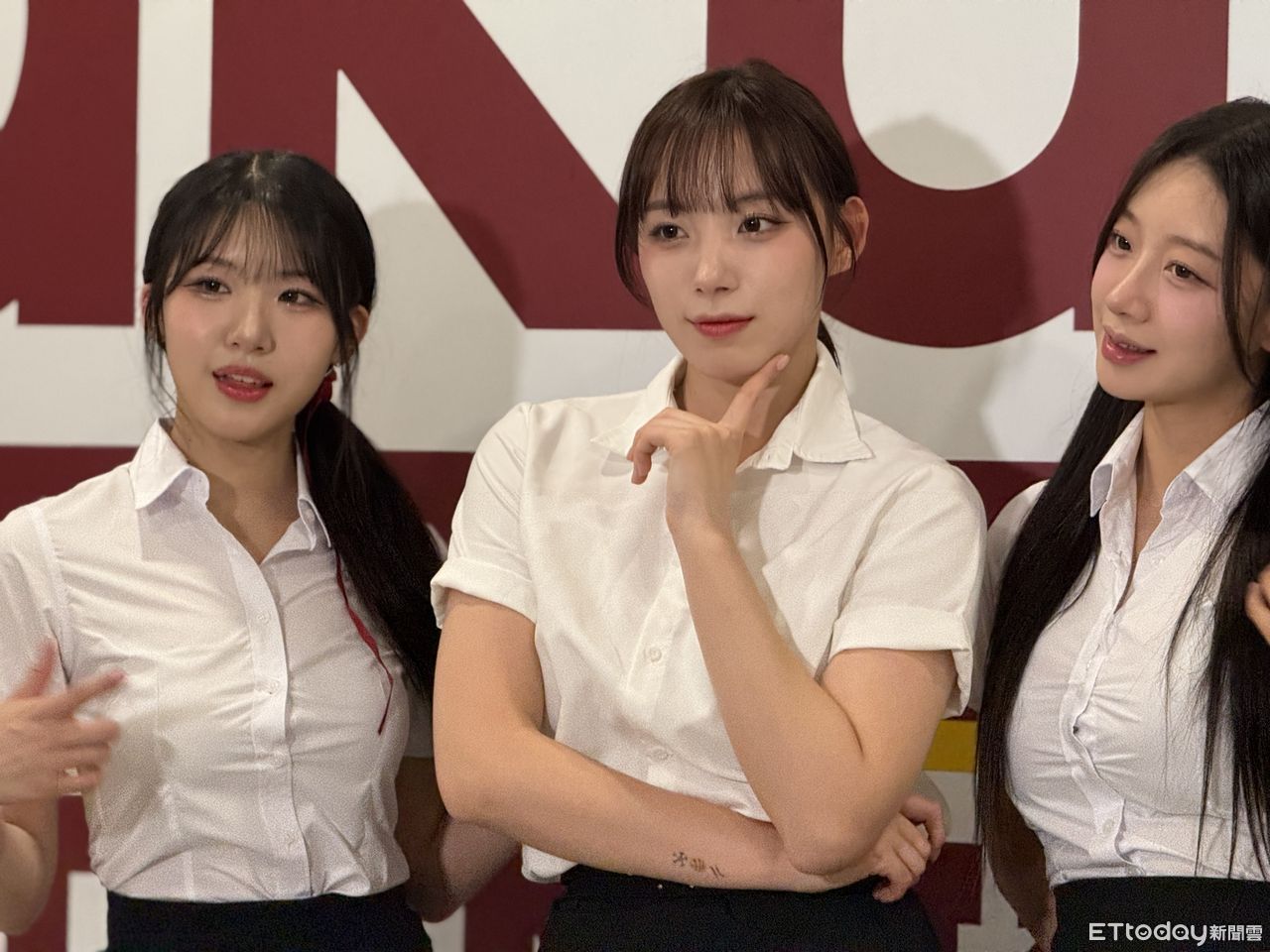 ▲ 樂天桃猿啦啦隊的三位韓籍成員廉世彬、河智媛與禹洙漢,於4月18日的「上班族趴」主題日首次合體亮相,身穿OL制服應援,為球迷帶來耳目一新的表演。 。(圖/記者王真魚攝)