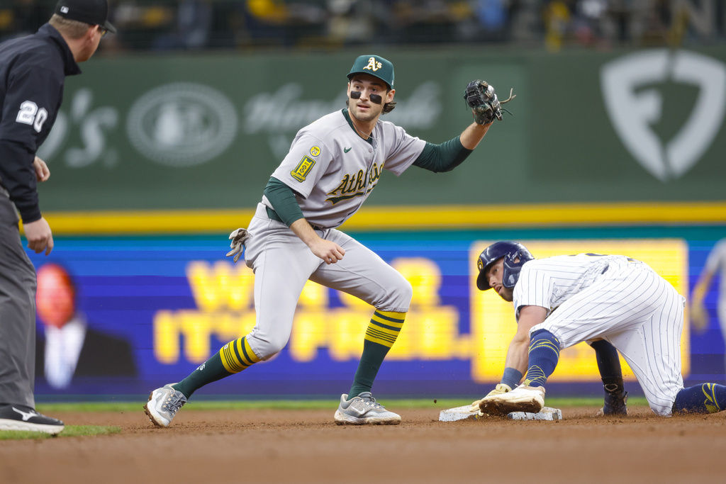 ▲密爾瓦基釀酒人隊德賓(Caleb Durbin)第四局盜上二壘,運動家威爾森(Jacob Wilson)則在一旁等待裁判的判決。(圖/達志影像/美聯社)