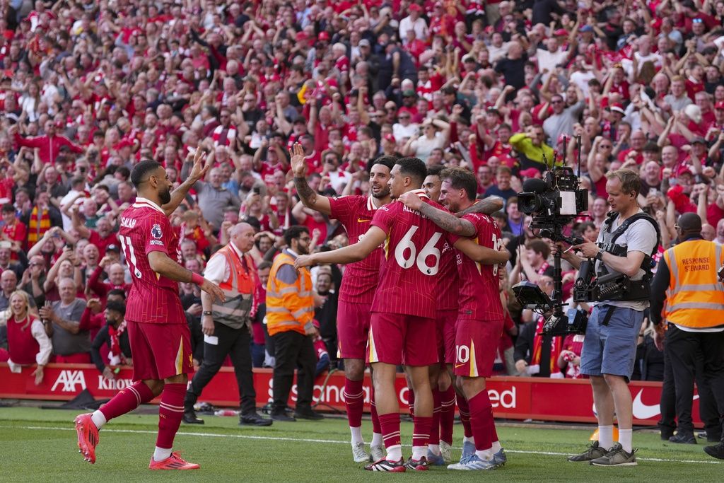 台灣時間28日凌晨,英超榜首利物浦在安菲爾德主場上演瘋狂進球秀,以5比1轟垮踢館的熱刺,提前4輪奪下2025年賽季英超冠軍,現場60000名紅軍球迷欣喜若狂,一同慶祝奪冠精彩時刻。