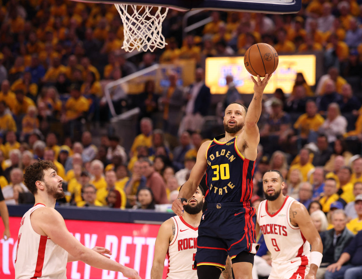 兩隊上半場激烈肉搏,合計共有21次犯規以及4次技術犯規、1次惡意犯規。勇士以波傑姆斯基(Brandin Podziemski)拿下13分、4助攻最佳,柯瑞則有10分進帳。火箭則以范弗利特(Fred VanVleet)拿下12分最高,布魯克斯11分次之。