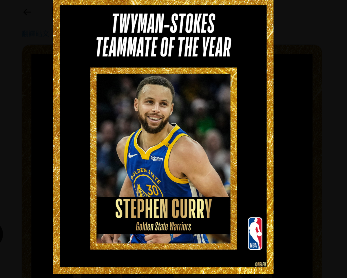 ▲勇士天王柯瑞獲得本季NBA年度最佳隊友。(圖/翻攝自X/NBA Communications)
