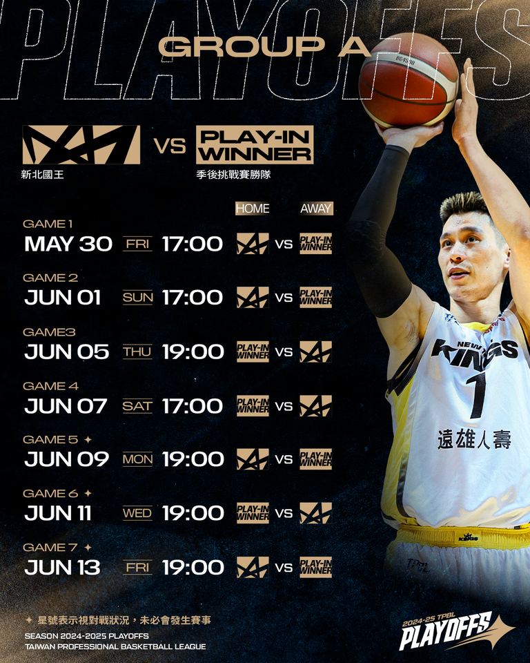 本季TPBL季後賽首階段為「季後挑戰賽」,採3戰2勝制,例行賽第4名享有1勝優勢,首戰訂於5月23日登場,G2在5月25日進行,勝隊將以第4種子身分,挺進4強戰對決例行賽龍頭新北國王。