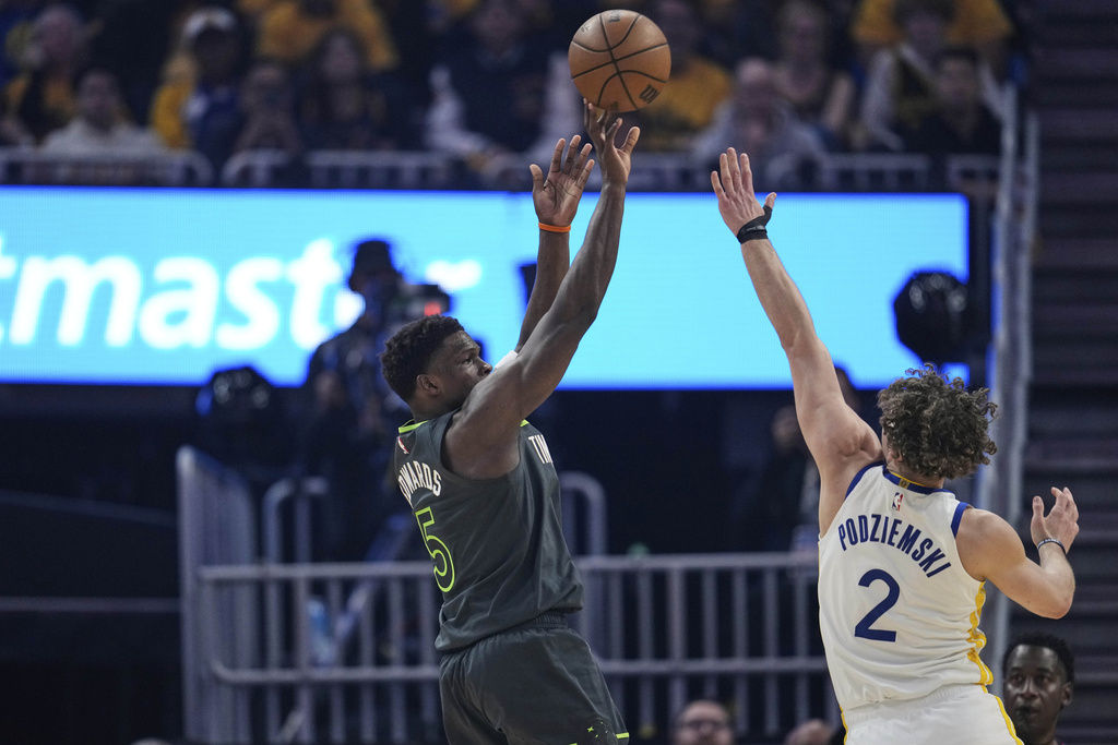 儘管灰狼上半場在三分線外比勇士多得18分,半場結束時卻仍落後2分。陣中多名主將戈貝爾(Rudy Gobert)、里德(Naz Reid)和迪文琴佐(Donte DiVincenzo)各自背上3次犯規;「蟻人」艾德華茲12投3中僅拿8分。