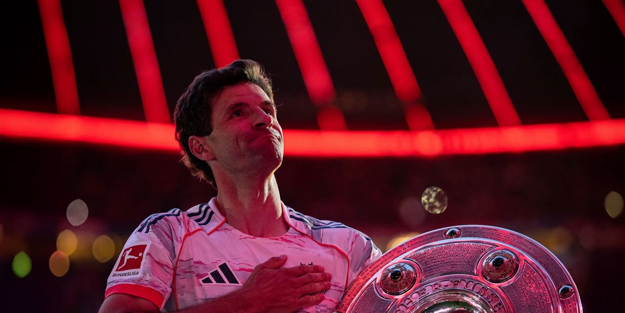 本場比賽拜仁靠著凱恩(Harry Kane)與奧利塞(Michael Olise)上下半場各進一球的好表現下,以2比0完成主場收官戰,終場哨聲響起後,先發球員們重新上場,領取德甲冠軍獎盤。這一刻穆勒不僅回到了球場,更率先高舉冠軍獎盤,走向南看台中心地帶接受主場球迷振臂歡呼。