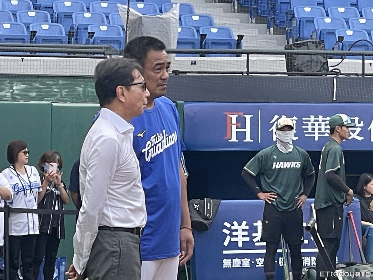 ▲富邦大董蔡明忠(左)來到悍將主場與教練團、球員談話。(圖/記者楊舒帆攝)