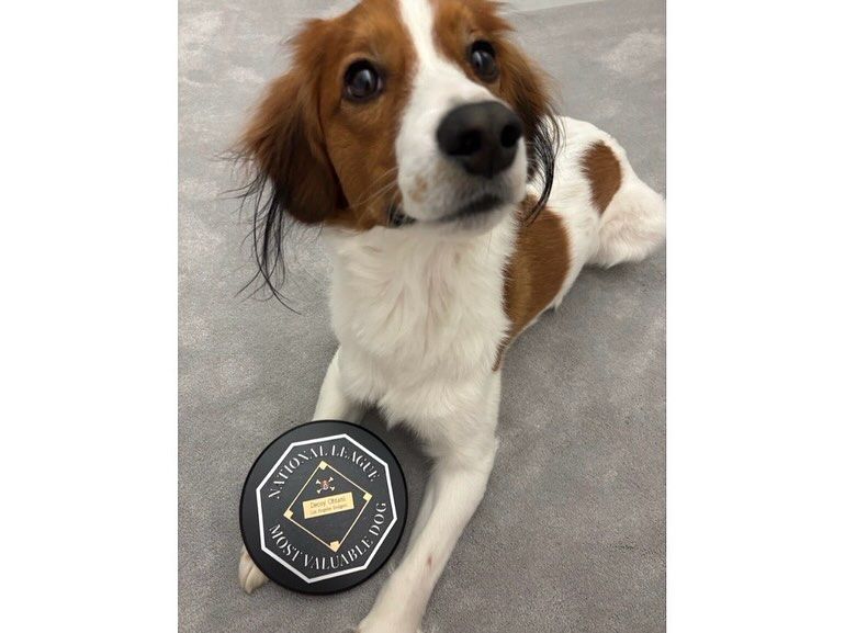從大谷分享的照片中可見,Decoy坐在花束與「2」字金色氣球前,乖巧模樣融化粉絲;更吸睛的是畫面中一面寫著「NATIONAL LEAGUE MOST VALUABLE DOG(國聯最有價值狗狗)」的小獎牌,造型幾乎與大谷MVP時所獲獎座一致。