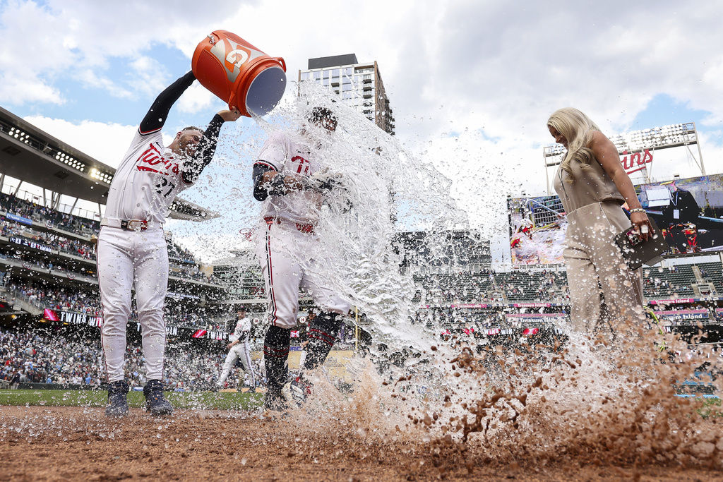 ▲雙城二壘手李(Brooks Lee)敲再見安接受隊友們慶祝。(圖/達志影像/美聯社)