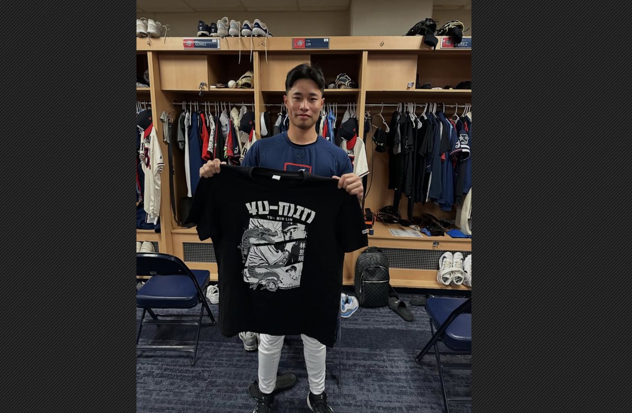台灣的左投手林昱珉站在個人置物櫃前,雙手舉著一件黑色的專屬紀念T-shirt,T-shirt 上印有他名字「YU-MIN LIN」、「林昱珉」以及極具漫畫風格的個人投球圖樣與龍形圖騰設計,展現濃厚的亞洲文化元素。