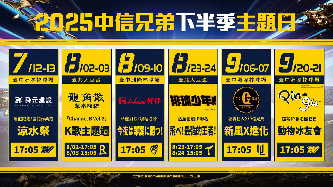 中信兄弟下半季主題週活動搶先公告!由舜元建設《暑假限定!國語作業簿:2025中信兄弟涼水祭》為下半季主題日揭開序幕,8月份球團也將在臺北大巨蛋舉辦最受大家矚目的龍角散草本喉糖《CHANNEL B vol.2》K歌主題週。接續而來的下半季賽事,也將帶給各位球迷全新的感官體驗!跟著中信兄弟的主題週行程,將行事曆劃上活動註記,一起來到球場參與下半季活動的美好時刻!