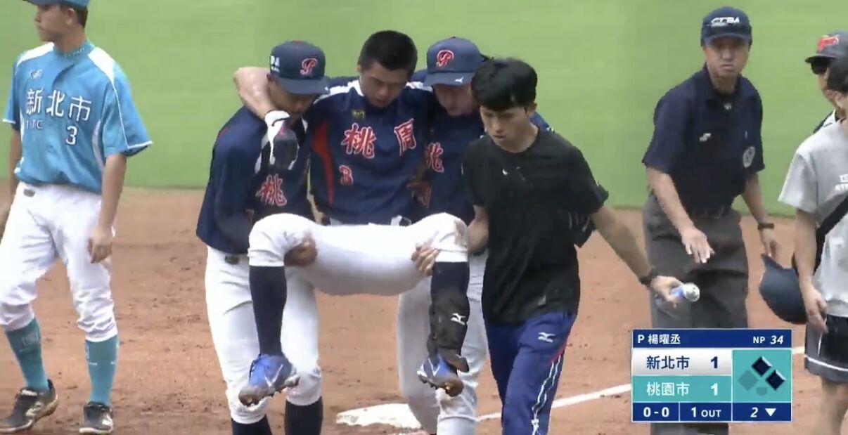 本場四強賽桃園對上新北,吸引多名球探到場關注潛力新秀。不料第2局發生驚險場面,桃園市7棒廖宥霖擊出適時安打後,因場地濕滑導致腳打滑,勉強一拐一拐跑上一壘後痛倒在地。