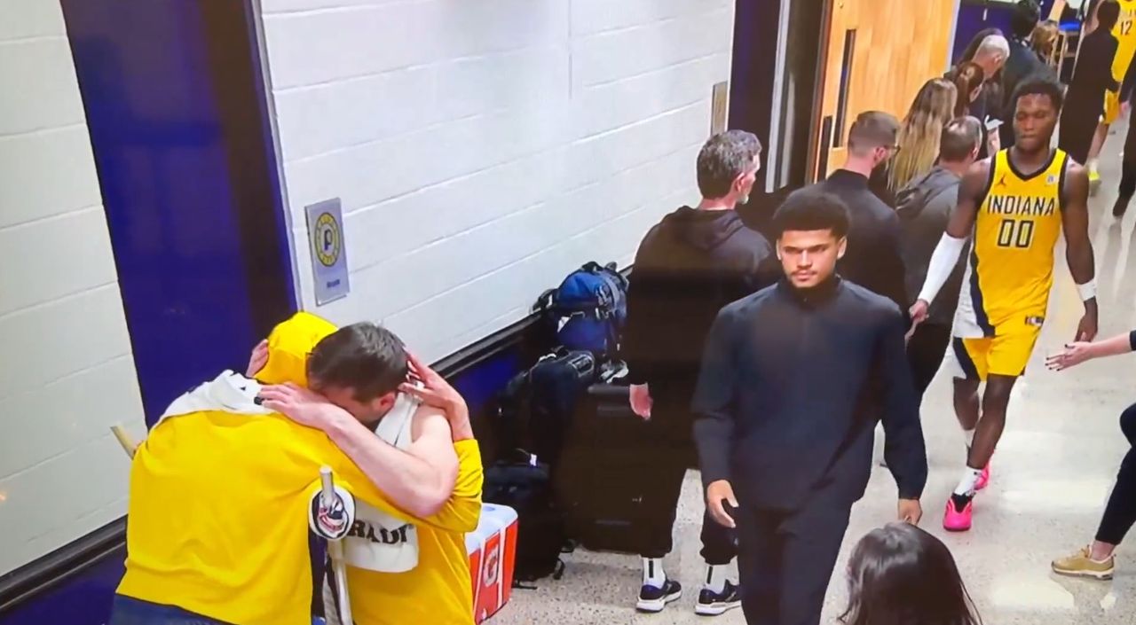 帶著小腿拉傷拚戰,最終演變成阿基里斯腱重傷的哈利伯頓,賽後拄著拐杖在球員通道迎接每一位隊友,畫面拍到今年季後賽屢屢扮演奇兵,被隊友稱為「白人救世主」的麥康諾紅了眼眶,傳奇前輩米勒將他擁入懷中安慰,當他走向哈利伯頓時再次情緒激動,拭去了淚水。