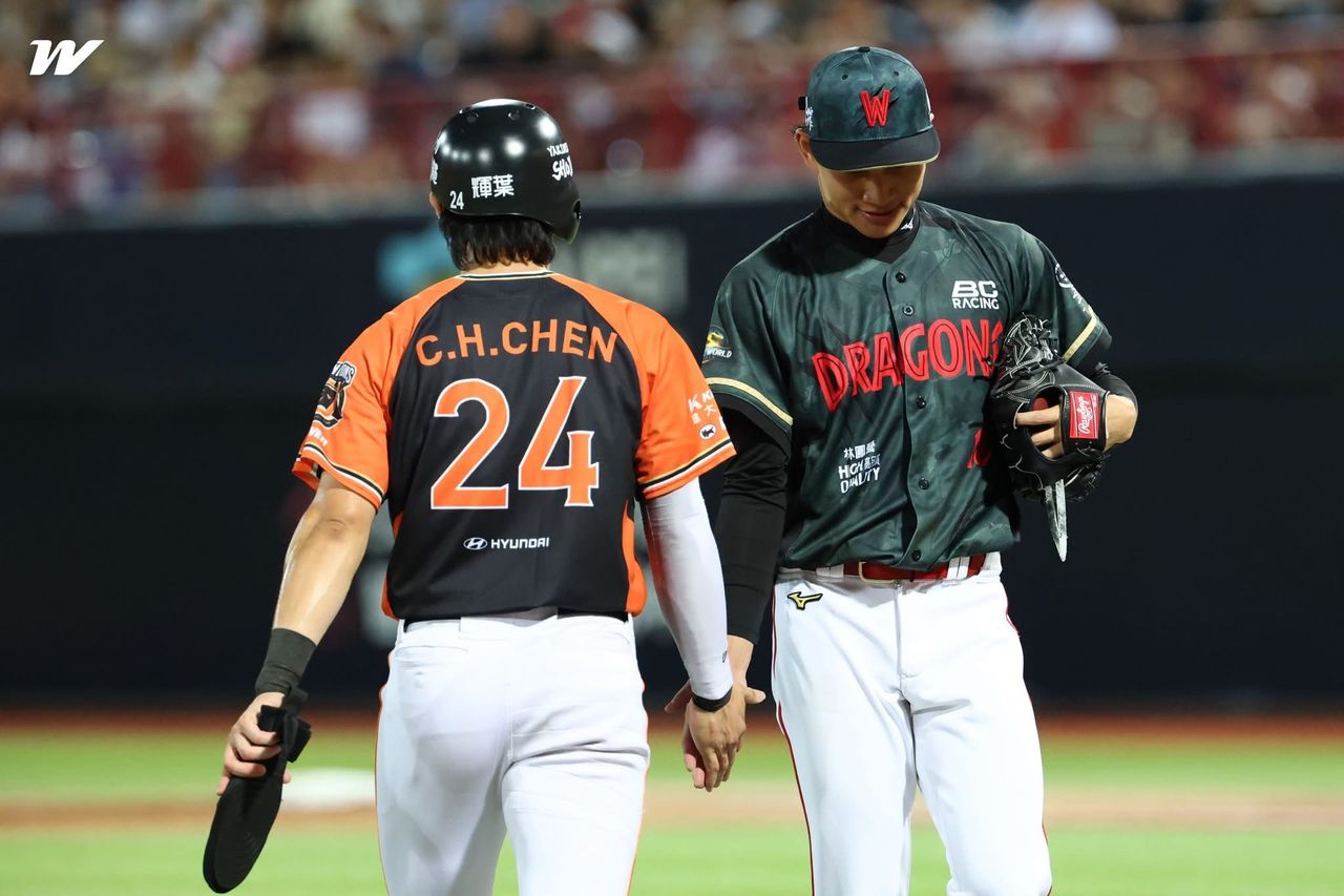 回顧第六局,陳傑憲靠游擊手失誤上壘,徐若熙成功守住危機,陳傑憲說,「對上中心棒次都很厲害,有辦法穩住情勢,滿值得讚許。他能冷靜危機處理,在壘上看他投球很享受。他的球數也很到了,(換局時)他看著我,我看著他,就對笑然後擊掌。」