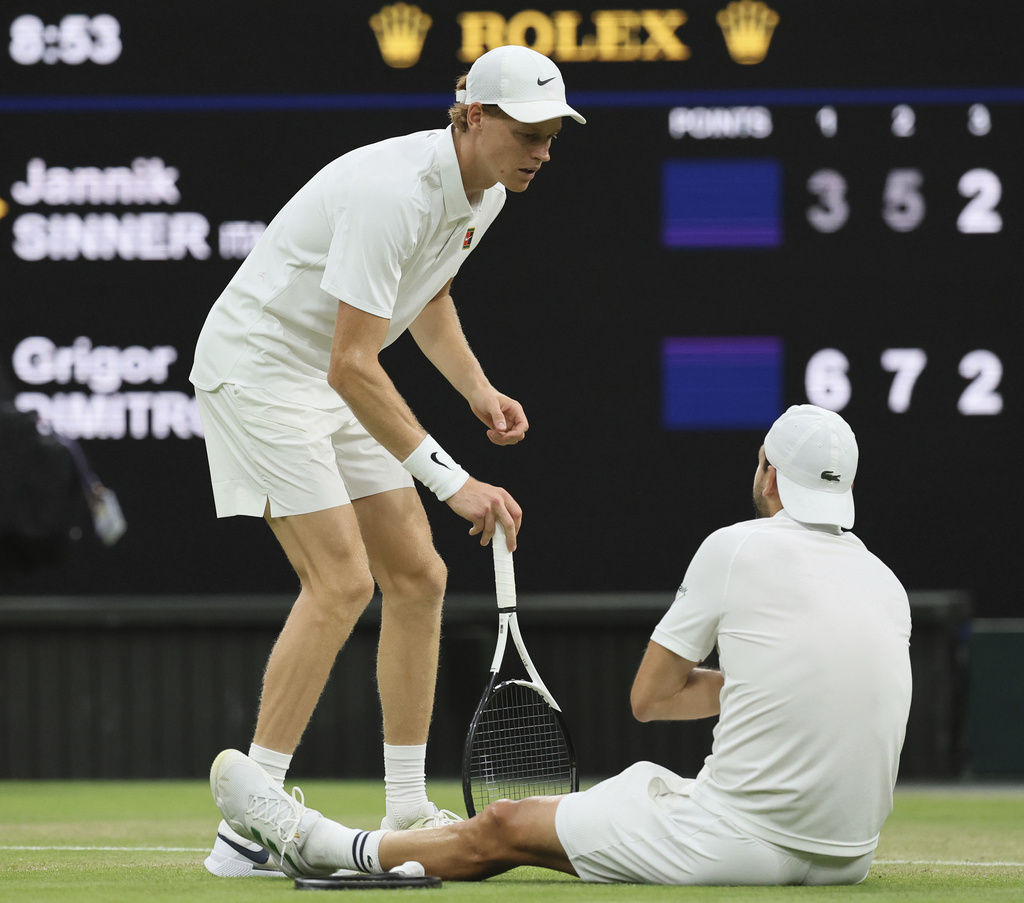 辛納是在與迪米特洛夫的比賽中,第1局滑倒並以右手撐地導致手肘受傷,隨後也在比賽中接受了醫療暫停治療,儘管他對場邊比出拇指示意無礙,但教練團很快察覺傷勢的影響。