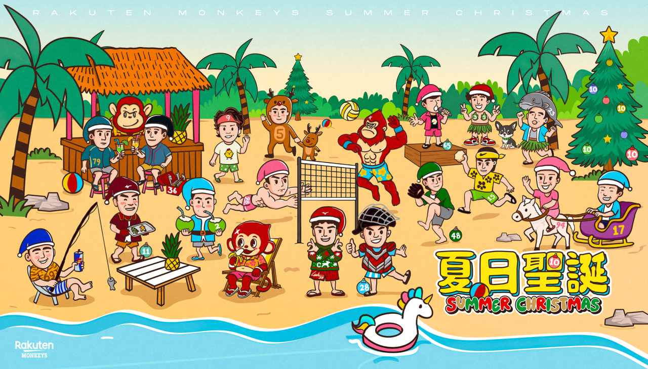 樂天球團也特別設計本次活動的主視覺,以手繪風格結合選手個性,將夏日與聖誕元素完美融合,展現Rakuten Monkeys專屬的創意活力。聖誕樹上的每個吊飾,都是球員手繪、獨一無二,為整體造景增添巧思。