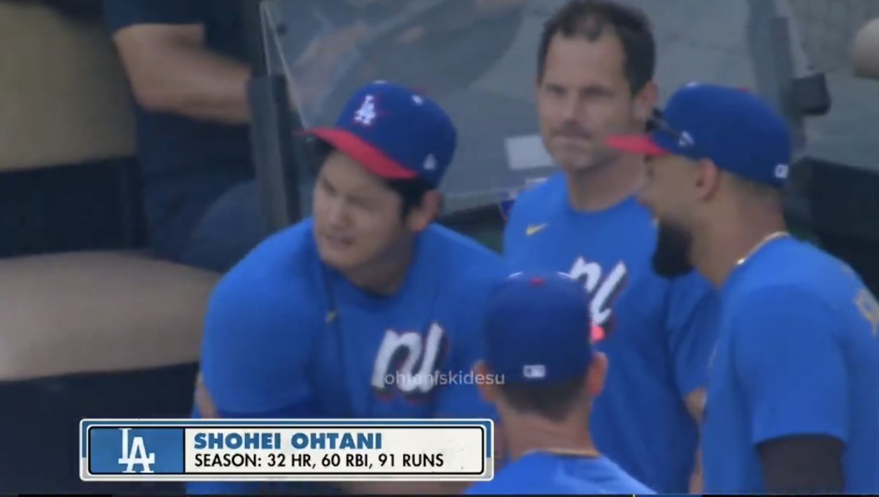 儘管未參加本屆全壘打大賽,大谷仍在場邊與其他球員熱絡互動。期間他特別走向曾效力於阪神、現為教士隊後援投手的蘇亞雷斯(Robert Suarez),一邊故作皺眉,一邊用手按著自己右肩下方,似乎在調侃一個月前對方所投出的那顆爭議性觸身球。