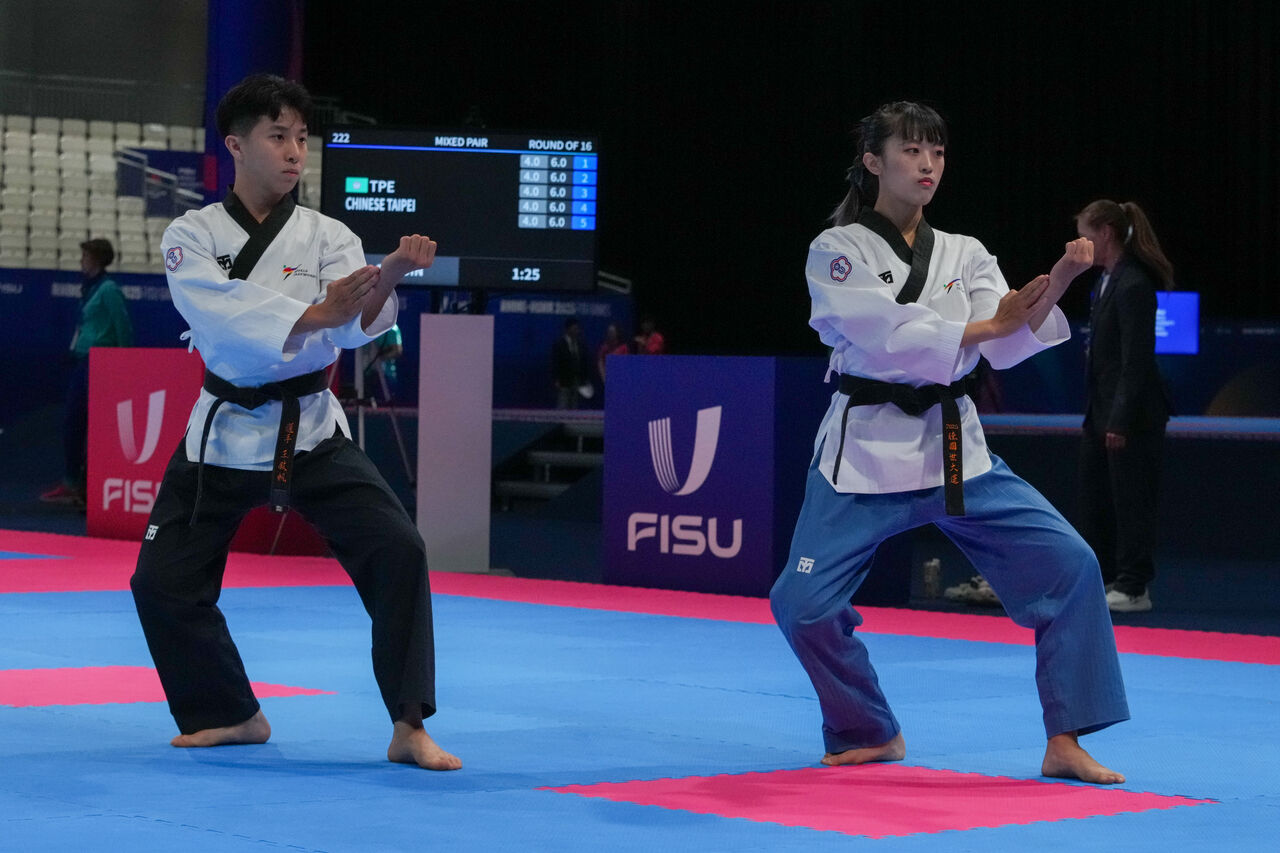 2025年德國萊茵魯爾世大運今(17)日開幕,中華代表團有3組跆拳道品勢選手登場,男、女個人賽部分,蔡和軒、徐悠然都止步16強,備受期待的混合雙人組王敍帆、簡湘玲則挺進決賽階段,今晚力拚台灣本屆首面獎牌,兩人在公認品勢項目表現完美,可惜自由品勢出現失誤,最終以平均總分8.249名列第7,錯過頒獎台。