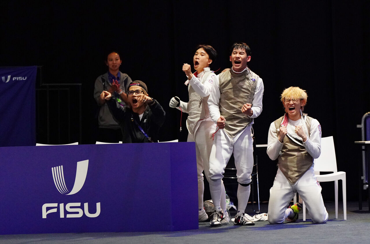 2025年德國萊茵-魯爾世大運擊劍項目,台灣時間22日進行最終日賽程,中華男子鈍劍代表隊在鈍劍團體賽距離奪牌僅有1分差距,但最終仍以44比45遭日本隊逆轉,中華鈍劍代表隊最終無緣4強以及隊史首面獎牌,只能繼續後續排名賽。