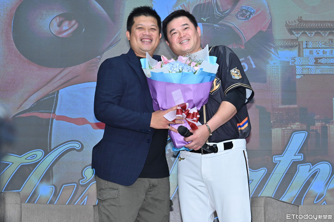 ▲ 統一 7-ELEVEN獅胡金龍榮耀引退記者會,陳江和特別到場獻花。(圖/記者李毓康攝)