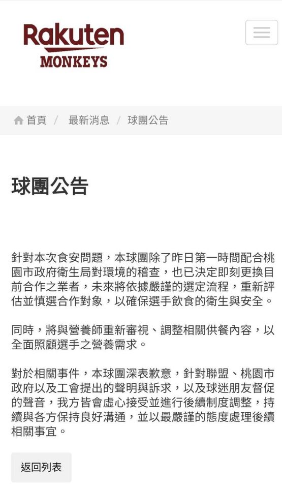 針對本次食安問題,本球團除了昨日第一時間配合桃園市政府衛生局對環境的稽查,也已決定即刻更換目前合作之業者,未來將依據嚴謹的選定流程,重新評估並慎選合作對象,以確保選手飲食的衛生與安全。
