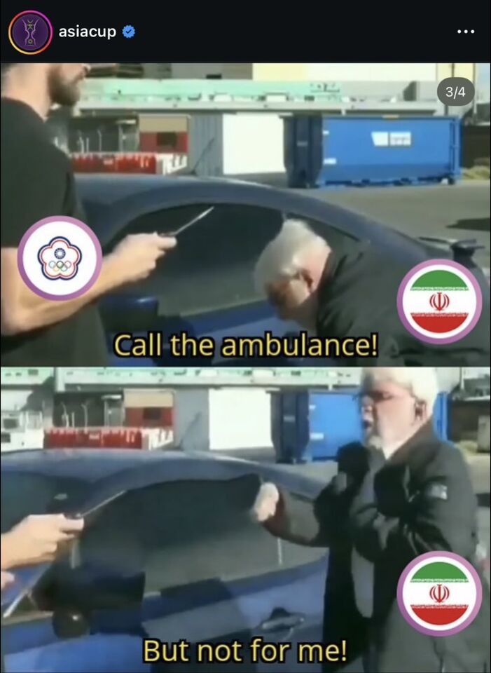 只不過FIBA亞洲盃官方IG社群,卻在此戰賽後放上一張經典迷因梗圖「叫救護車,但不是幫我」(call the ambulance but not for me),且照片上還放上伊朗與中華隊隊徽,此貼文一齣,也引發許多網友留言批評,直言比賽已經「8打5」,甚至認為這樣的發文對中華隊相當不尊重。