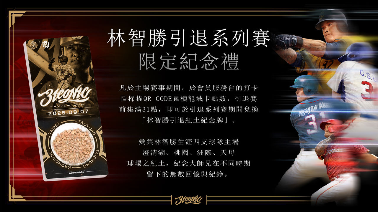 為回饋球迷支持,味全龍球團特別推出了「智勝一擊」引退賽響應活動,球迷可在天母與大巨蛋主場的留言牆上為林智勝送上祝福;此外還可以在每場主場賽事期間,於會員服務台的打卡區掃描QR Code累積龍域卡點數,若在引退賽前集滿31點,即可於引退系列賽期間兌換「林智勝引退系列賽限定紀念禮」。這份限定紀念禮蒐集了澄清湖、桃園、洲際、天母四座球場紅土,這些場地承載著林智勝最精采的揮棒與奔馳,更象徵著他二十餘年來在球場上的汗水、拼勁與堅韌不拔的精神,每一粒紅土都記錄著「大師兄」與球迷共同走過的歲月。這份入場禮不僅是收藏,更是一段傳奇精神的濃縮與傳承。