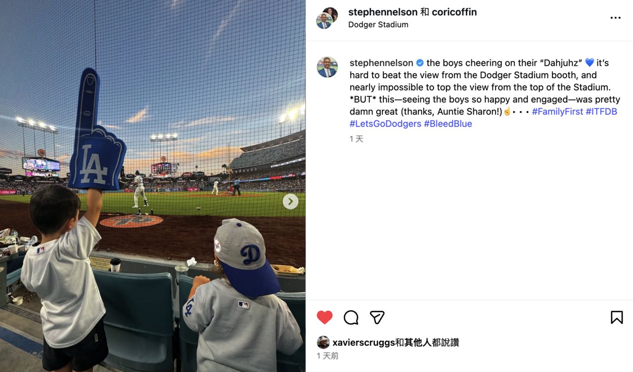 尼爾森在貼文寫道:「這兩個小傢伙正在為『Dahjuhz』加油。要超越從播報席看到的風景已經很難了,更別說球場頂層的視野,但看到他們如此開心、全神貫注,真的太美好了。」其中「Dahjuhz」是孩子們還發不清楚「Dodgers」時的可愛發音。