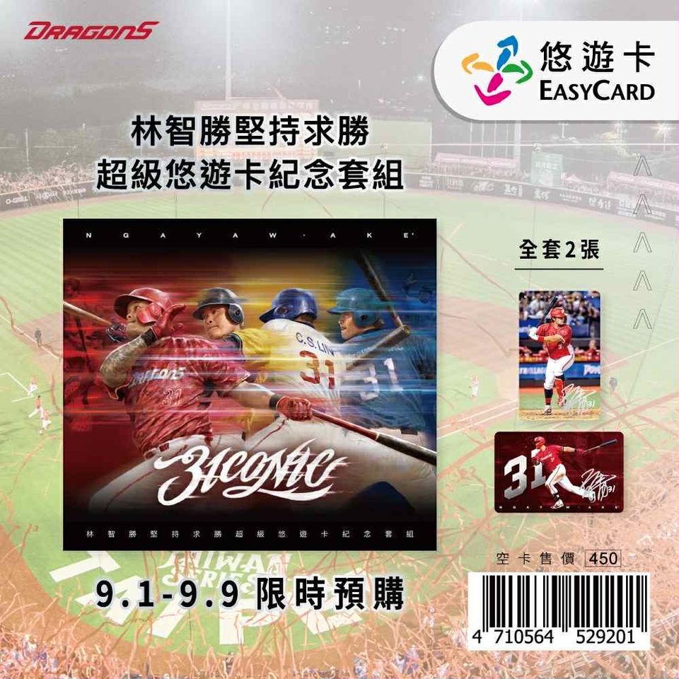 『林智勝堅持求勝超級悠遊卡紀念套組』自9月1日上午11:00起至9月9日23:59止,限時不限量開放預購,民眾可在7-ELEVEN ibon機台、全家行動購、萊爾富、誠品線上、momo購物網、博客來悠遊卡旗艦館、PChome24h購物同步開放預購,每套共2張卡片,售價450元,球迷們收藏經典之餘,還能實際幫助偏鄉棒球發展,千萬別錯過!