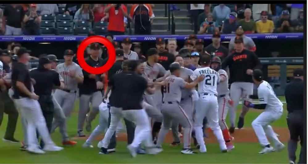 隨後2隊球員全數衝出板凳,雙方在投手丘與二壘一帶爆發激烈推擠混戰,台灣球迷瘋尋目前正在巨人大聯盟名單內,身披66號球衣的鄧愷威,「欸那個66號在哪?」結果鄧愷威今日因休兵,僅身披1件黑色練習衣,一步一步跳入衝突的人群深處,網路上隨即傳來大量搞笑祝賀,「恭喜愷威解鎖大聯盟第一次清板凳。」